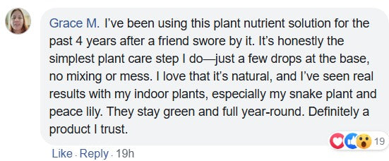 "As someone who loves caring for plants, it's always disheartening when one doesn't thrive, and I'm left wondering why. Since using this plant nutrient solution, all my plants look healthy, vibrant, and full of life. It’s incredibly easy to use—just drop 3 to 4 drops straight from the bottle at the root of the plant. No mixing, measuring, or guesswork involved. It has truly made plant care a breeze. No more sadness over wilted plants."